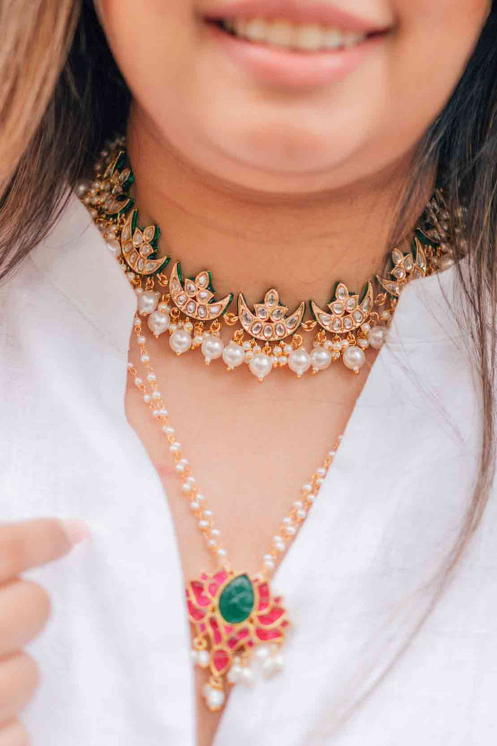Antique gold finish, gold plated kundan chaand tara choker with dangling pearls. Comes with an adjustable dori.