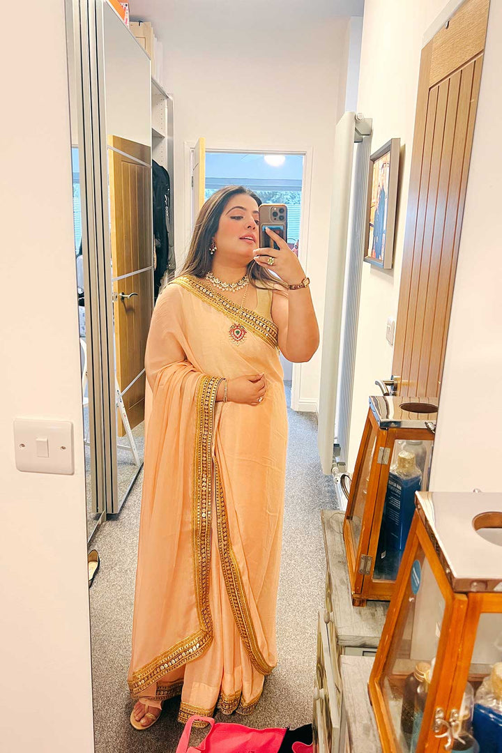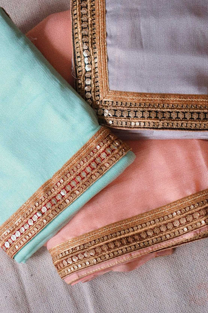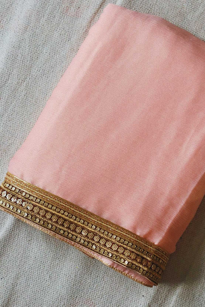 Festive chiffon sari. Shimmery material, with embroidered border. Border contains zari, tilla and sequin work.Â