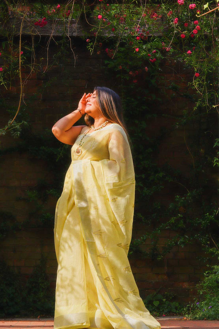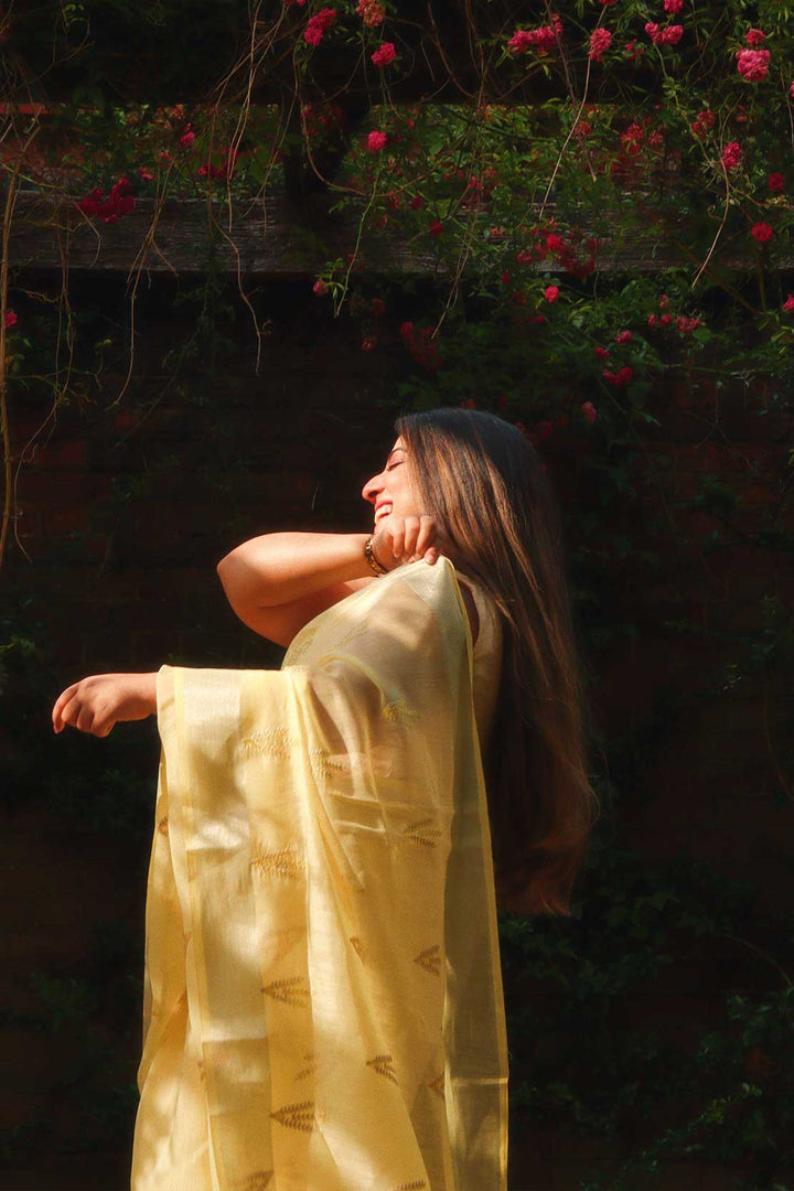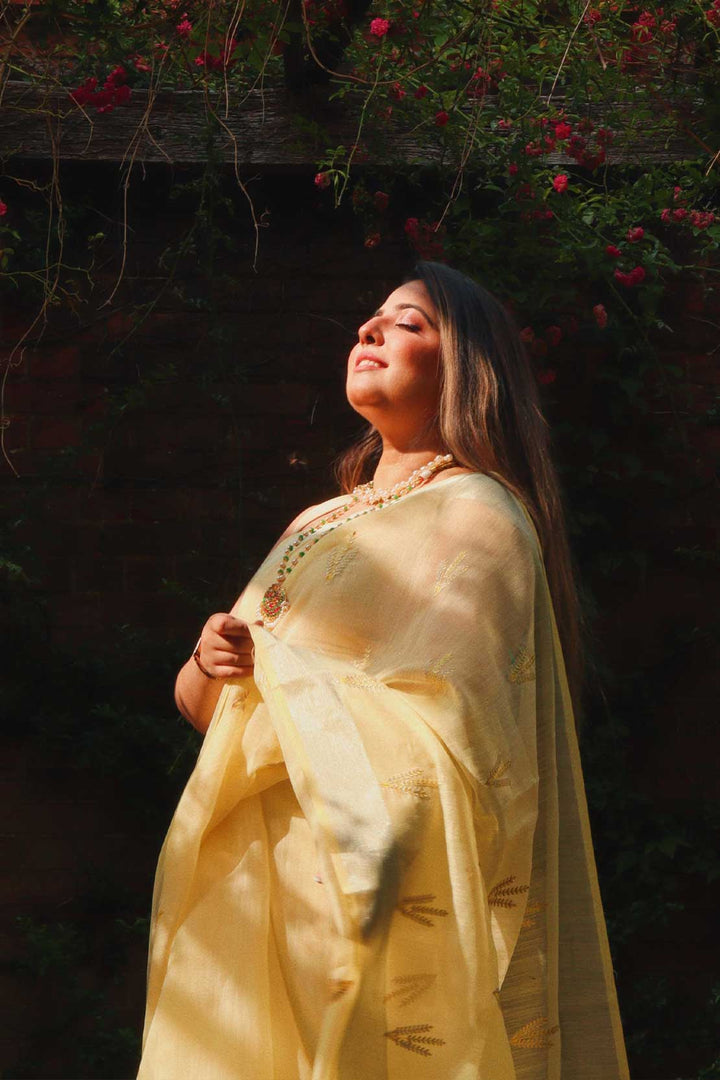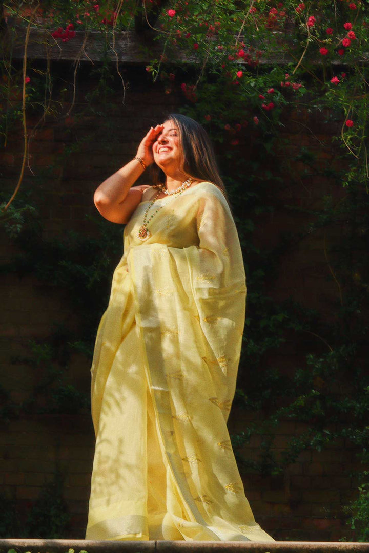 Premium and soft organza silk, perfect for a day time event. The sari is adorned with embroidered motifs all over and lined with a silver border.